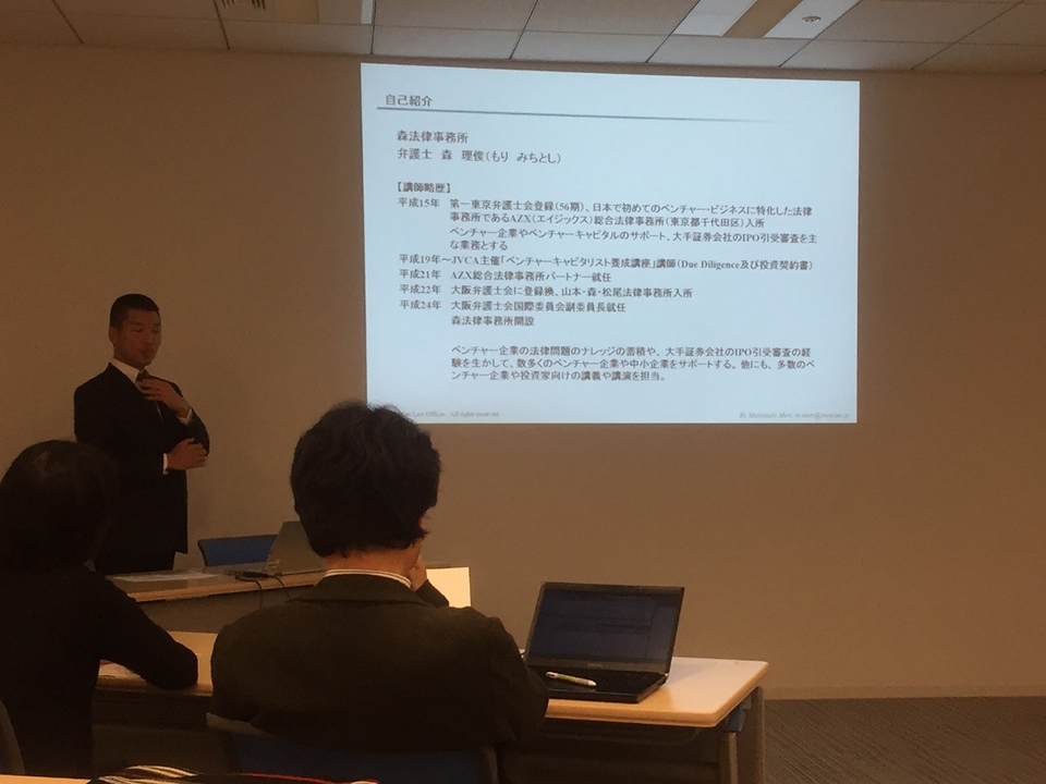 今回はベンチャーファイナンスについて、創業から成功・失敗までの流れの概要を説明して頂いた上で、実際のケースを挙げて説明して頂きました。