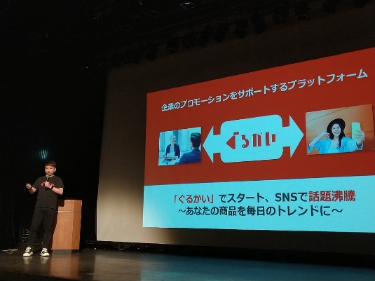 次に登壇したのは、一般ユーザーがインフルエンサーとして企業のPRに貢献できる仕組みを提供する株式会社ぐるかいの王氏。企業は知ってもらいたい商品を「ぐるかい」に掲載し、ユーザーはその中で気になった商品を自身のSNSで拡散。一定の「いいね」を集めると商品が提供されるというモデルです。ユーザーのリアルな声をマーケティングに生かすことで、PRに予算をかけられないスタートアップなどのプロモーション課題を解決します。