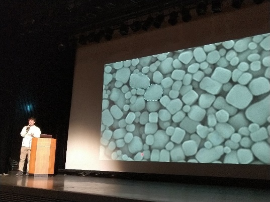 続いての登壇者は、微細な「粒子」と向き合う研究者をAIで救う株式会社KNiTの窪内氏。研究現場では、顕微鏡に映し出される粒子の数とサイズを手作業で計測するというアナログな作業が発生します。同社は粒子の画像から自動的にサイズ、形、色を数値化し、研究者の労力を大幅に削減するAIを開発し、研究機関のほか、製造業に向けてサービス拡大を狙っています。