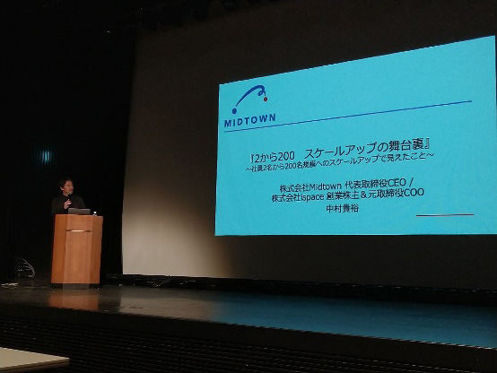 まずはじめに「『2から200 スケールアップの舞台裏』~社員2名から200名規模へのスケールアップで見えたこと~」と題して基調講演が行われました。登壇したのは「宇宙×気候変動×生物多様性」をテーマに2022年に株式会社Midtownを設立した中村貴裕氏。Midtown設立前は宇宙ベンチャーである株式会社ispaceの設立に関わり、2名のボランティアから始まった同社を200名規模へ成長させ、IPOを実現するまでの道のりを紹介し、今後グロースをめざす起業家へアドバイスとエールを贈りました。