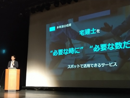 続いては、不動産取引に欠かせない専門職である宅建士の課題に挑む株式会社SKILL SPARKの茅原氏。宅建士の人材不足が叫ばれる一方、資格保有者の7割は業界の外で働いていると言います。そこで同社は宅建資格を持つ人が在宅で働けるギグエコノミーモデルを構築し、重要事項説明の録画や発言内容の自動処理など、テクノロジーを駆使してサービス品質への不安を解消します。
