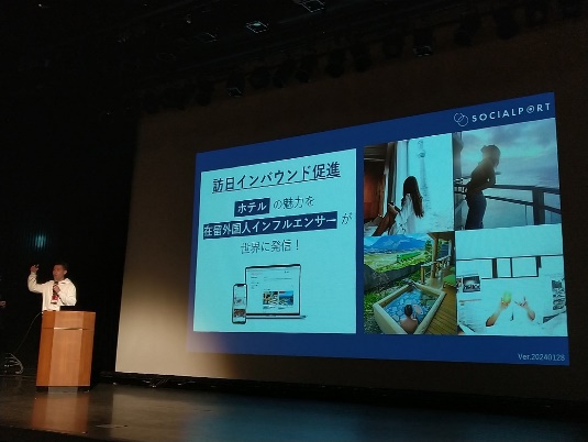 次に登壇したのは、訪日外国人のホテル検索に新たな選択肢を提供するSOCIALPORT株式会社の齋藤氏。外国人が日本でホテルを探す際、もっとも頼りにするのは在日の自国民だと言います。そこで同社は在日外国人がインフルエンサーとして日本のホテル情報を発信できるプラットフォームを構築。将来的には宿泊業界だけでなく、他のインバウンド関連業種への水平展開も視野に入れています。