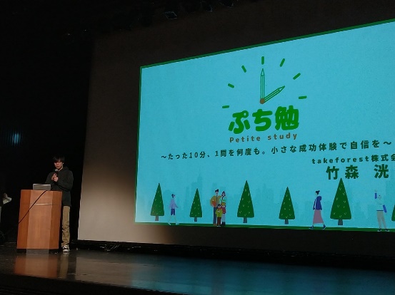 続いては勉強に悩む子どもたちに救いの手を差し伸べるtakeforest株式会社の竹森氏。勉強についていけず自己肯定感が下がったり不登校になったりする子どもが増えていると言います。自身も同様の経験を持つ竹森氏は、「10分間で1問だけ」という無理のない形で勉強を習慣化できるサービスを構築し、小さな達成感を積み重ねることで子どもたちの自己肯定感を育み、教育課題の解決につなげます。