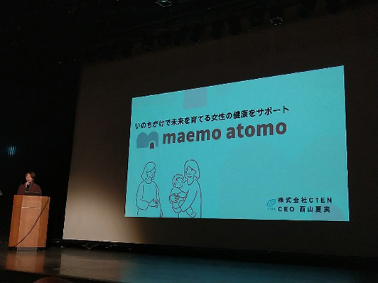 続いて登壇したのは、女性の妊娠・出産を健康面でサポートする株式会社CTENの西山氏。さまざまな病気のリスクが伴う妊娠・出産は、まさに命がけのライフイベントです。助産師として働き、母子ともに命を落とす場面を経験したこともある西山氏は、産前産後の専門的なケアの不足を解消すべくCTENを設立し、妊娠中の運動指導と産後の適切な健康管理を包括的に行う国内初のサービスを提供します。