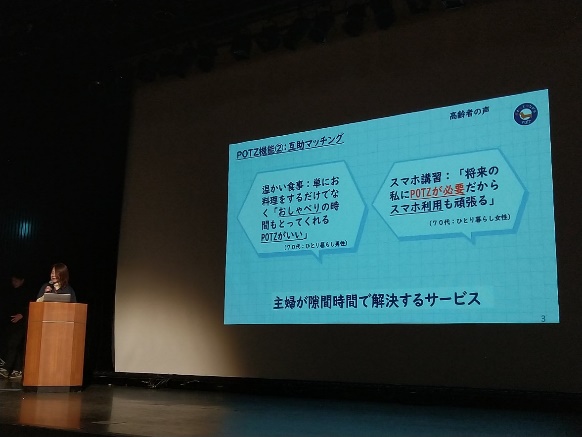 続いての登壇者は、高齢者の生活支援に関する課題に挑む、株式会社ポチっとつながるPOTZの佐藤氏。高齢化によって介護離職や孤独が問題となる中、困りごとを抱えた高齢者を近所の主婦がギグワーカーとしてサポートできるプラットフォームを開発し、原体験となった自身の介護経験も交えた熱いピッチとなりました。