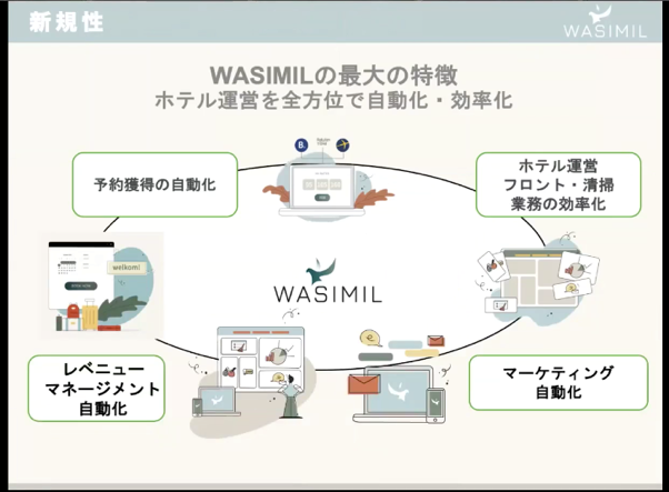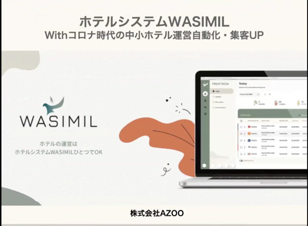 株式会社AZOOは、コロナ禍でさらなる運営効率が求められる中小ホテルに向けて、膨大な業務を効率化するホテルシステム「WASIMIL(ワシミル)」を開発、販売しています。既存のホテルシステムはそれぞれ機能が個別にあり、複雑で連携もしにくいのに対し、宿泊管理等の自動化など様々な機能が一元化されており、サブスクリプション型の価格設定でコスト削減ができるのが特徴です。