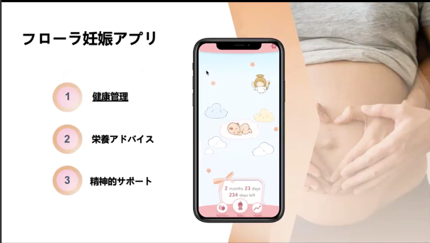 Flora株式会社は独自のAI(人工知能)アルゴリズムで、妊活・出産・育児に対する新しいソリューションを生み出し、現在は妊娠、産後のヘルスケアサポートをメインとしたアプリなどを開発。日本では3人に1人が35歳以上で出産し、肉体だけでなく精神的な負担も大きいことから、妊娠中の女性をサポートするポケット助産婦「フローラ妊娠アプリ」を開発しています。スマホで健康情報を収集、可視化し、独自に開発したAIで食生活を支援するシステムを用いた栄養サポート、チャットボットによるメンタルサポートを行う機能が搭載されています。