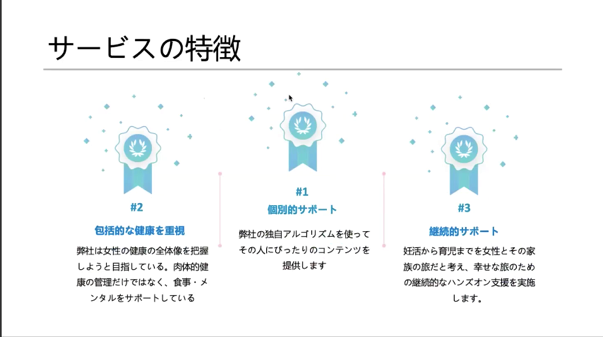 個人にあわせたサポートやコンテンツを提供することが可能で、妊活から育児、仕事の復帰まで対応可能です。昨年12月にリリースしたベータ版は広告無しのB2Bモデルで300人に1ヶ月利用され、好評を得ました。また、シンガポールのアクセラレーションにも参加する予定であり、ピッチではロードマップや売り上げ予想なども発表されました。