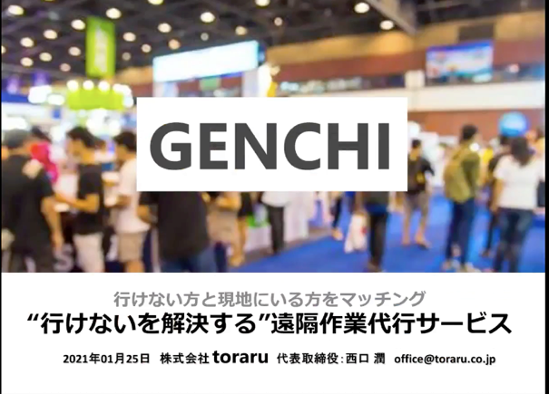 株式会社toraruは、コロナ禍でますます遠ざかる旅の機会や行きたい場所に「行けない」ことを解決する複数のソリューションを開発しています。「genchi」は、現地にいる人と現地に行きたくても行けない人を繋ぐクラウドソーシング型のサービスで、今回は展示会での対応にターゲットを当てて紹介がありました。