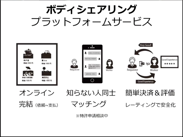 現地にいる人にスマホで会場を中継してもらうという人間版Uberのような仕組みで、マッチングから決済、評価までトータルに行うボディシェアリング・プラットフォーム・サービスで特許も取得しています。