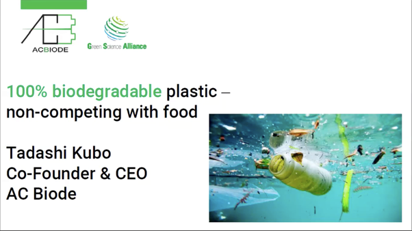 最初に登壇したAC Biode株式会社は化学技術をベースにしており、世界初の独立型交流電池、プラスチックごみを化学分解する触媒などを開発し、一部発売も進めています。中でも独自開発する100%生分解性のバイオプラスチックは、これまで同様の製品で問題とされていた、食べものとの競合、石油由来の成分が混ぜられている、加工しにくいといった問題を解決。数週間で分解できる上に加工しやすく、バリエーションもあります。