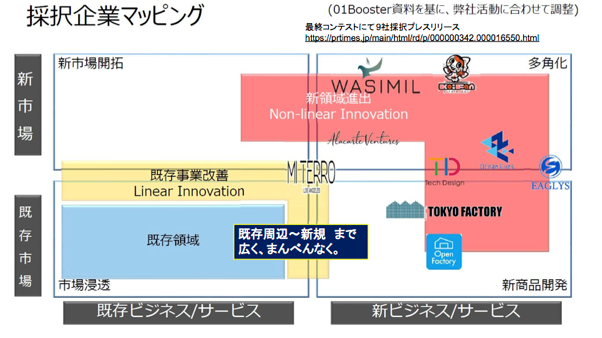 プログラムを実施した背景としては、社内で新規ビジネスが生まれにくいという声が増え、また、新規ビジネスの方向性としてもモノだけを売る体制から脱却する必要がある、と議論された事がきっかけです。そしてその活動を自社だけで取り組むにはアイデアなどに限界があるだろうと考えた事から、外部と連携するオープンイノベーションへの取り組みを決めました。プログラムの目的は、既存領域でのスタートアップとの協業、新規領域では市場の情報収集と参入機会のリサーチ、そしてスタートアップとの協業感覚を掴むという3つを設定。募集領域は初めてということもあり全ての事業部門を対象にしました。採択企業が扱うビジネスやサービスは全て新しく、全ての領域にいずれかがあてはまることがマッピングで確認できました。