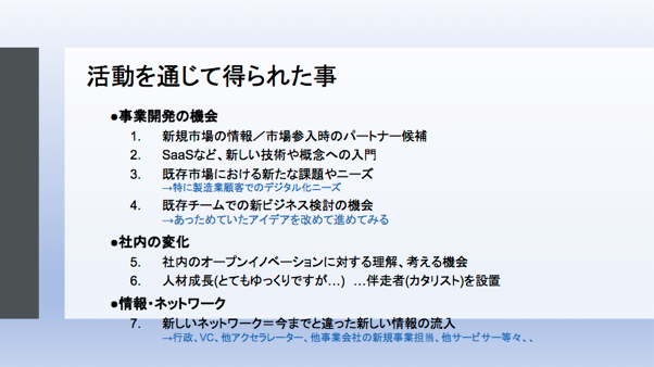 活動を通じて何が得られたかを、事業開発の機会、社内の変化、情報とネットワークの3つでまとめ、中でも事業開発の機会として、新規市場の情報やパートナー候補が得られたこと、新しい技術や概念の入門ができたこと、既存市場の新しい課題やニーズを聞く機会になったこと、そして、既存チームで新たにビジネスを検討する機会が生まれたことの4つを挙げています。
