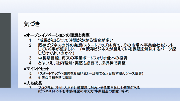次期構想と将来像として、事業会社との連携、起業家コミュニティとの交流、起業志向の学生が参加する機会を設け、関係の形を広げたいとしており、最後にオープンイノベーションの理想と実際、マインドセット、人の成長で、それぞれどのような気づきがあったかも紹介されました。