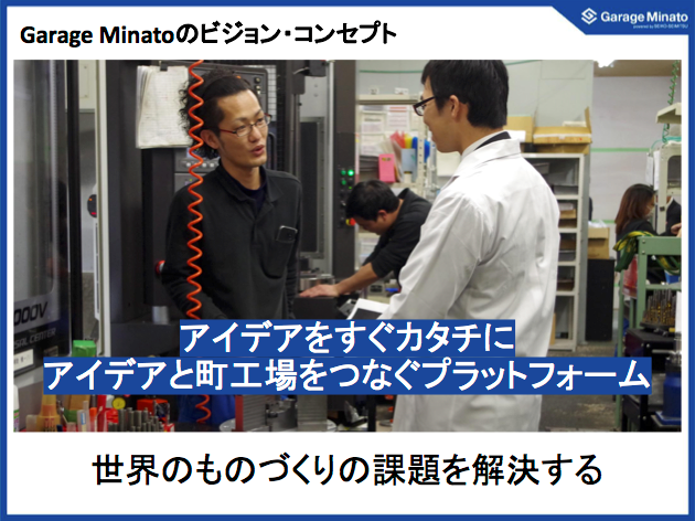 インキュベーションプログラムのGarageMinatoは、ベンチャーや新規事業の課題であるアイデアやプランをカタチにするまでの道のりを支援すると同時に、町工場が抱える課題を解決するために立ち上げられました。「アイデアをすぐカタチに、アイデアと町工場をつなぐプラットフォーム」をコンセプトに、世界のものづくりの課題解決を目標に掲げています。