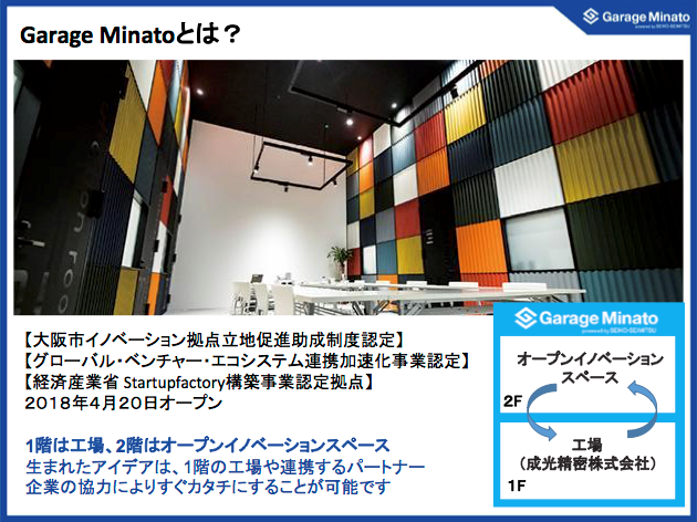 大阪市イノベーション拠点立地促進助成制度、グローバル・ベンチャー・エコシステム連携加速化事業、経済産業省StartupFactory構築事業の認定を受け、2018年4月20日に活動拠点をオープン。工場の2階にオープンイノベーションスペースが設けられ、アイデアから製作までの時間をスピードアップできます。