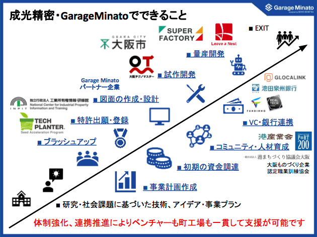 成光精密株式会社からは「『Garage Minato(ガレージ ミナト)』エリア内連携で挑むものづくり支援」と題し、自社で運営するスタートアップ・インキュベーションプログラムの活動内容を中心に紹介されました。