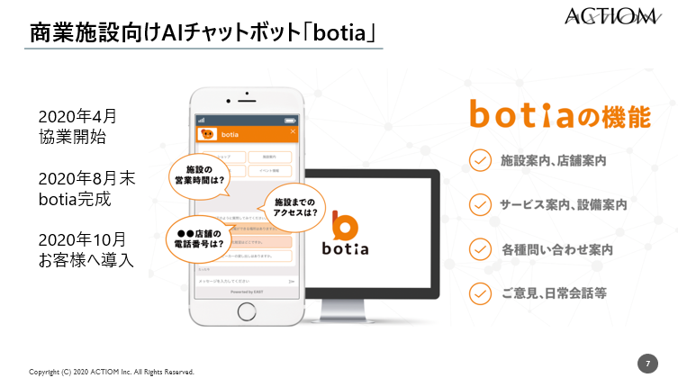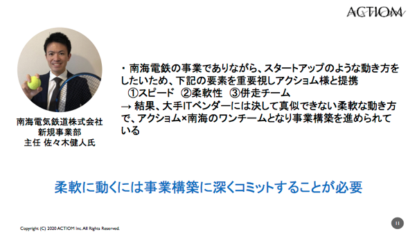 オープンイノベーションの事例では、株式会社イーストのAIチャットボット「botia」の開発例を紹介。経験と実績が無い学生起業が信頼を得るにはモノを見せる方が早いと考え、議論を重ねるより手を動かしてスピーディーに対応したことが評価されました。南海電気鉄道株式会社とはアジャイル型の新規事業開発先を探していたことから協業がスタートし、テニスコートの予約ができるテニスプレイステーションプラットフォームサービス「LAWN」の開発では、柔軟な対応をするため事業構築にまで深くコミットできたことが成果につながったといいます。