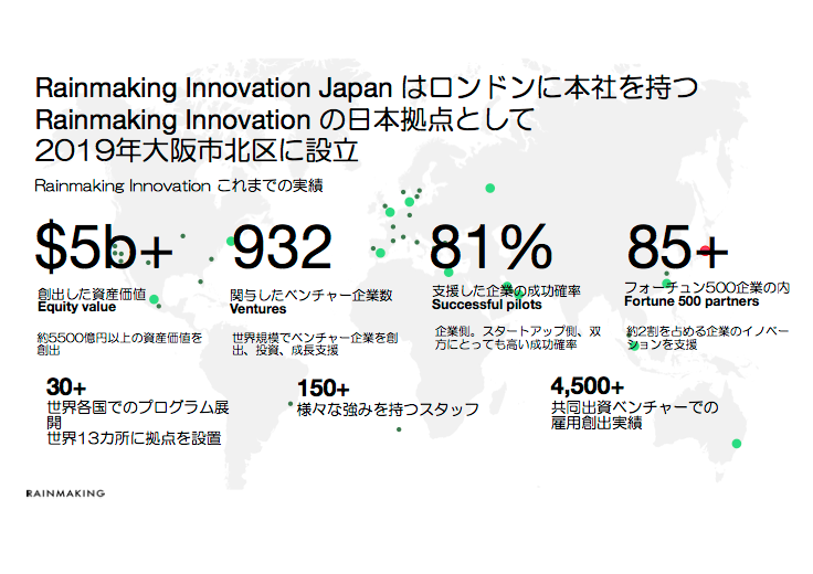 最初のプログラムでは、Rainmaking Innovation Japan (以下、Rainmaking)の吉田 匡 氏による講演「海外アクセラレータから見た効果的なオープンイノベーションとは」が行われました。同社はロンドンを拠点とするRainmaking Innovation Limited の日本法人として2019年に大阪市北区に設立され、アクセラレーションプログラムの提供や大学の産学連携などに携わっています。
