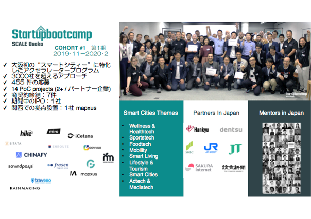 大阪初のスマートシティに特化したアクセラレータープログラム「Startupbootcamp Scale Osaka」(以下、SBC大阪)は、第1期で455件、先日デモディが行われた第2期は550件の応募があり、採択された10社と実証実験を行い、大阪を中心としたパートナー企業と共に事業を展開しています。