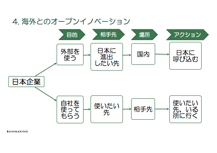 具体的に何をするか決まっていれば決め打ち。ある程度やりたい分野が決まっていれば偶然を求めて展示会などに参加する、何か新しくやることを探す場合は既存のプログラムに参加したり、分野を特定しないアクセラレーターを主催するというように、目的にあわせて方法を使い分けることが効果につながりやすくなります。