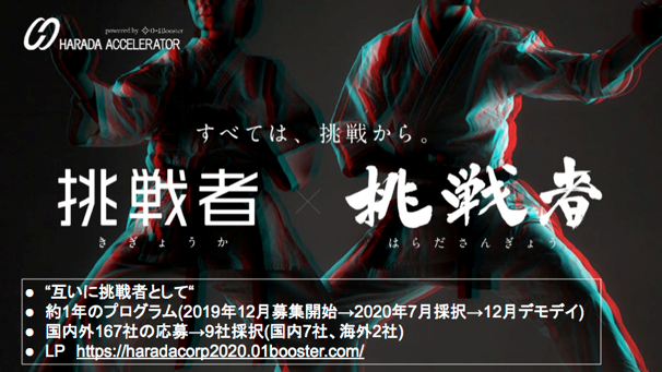 大阪で1923年に創業された中堅老舗総合商社の原田産業は6つの事業領域があり、大阪、東京、アジア、欧州を主な活動拠点としています。BtoBネットワークに強く、ニッチ市場を見つけ、顧客課題を解決するモノを商社ならではの柔軟性で世界中から見つけてきた企業です。2020年に起業家と互いを挑戦者として切磋琢磨するアクセラレーションプログラムを立ち上げ、国内外から応募された167社から9社を採択し、約1年間行われた活動での気づきや今後にどう結びつけていくかが話されました。