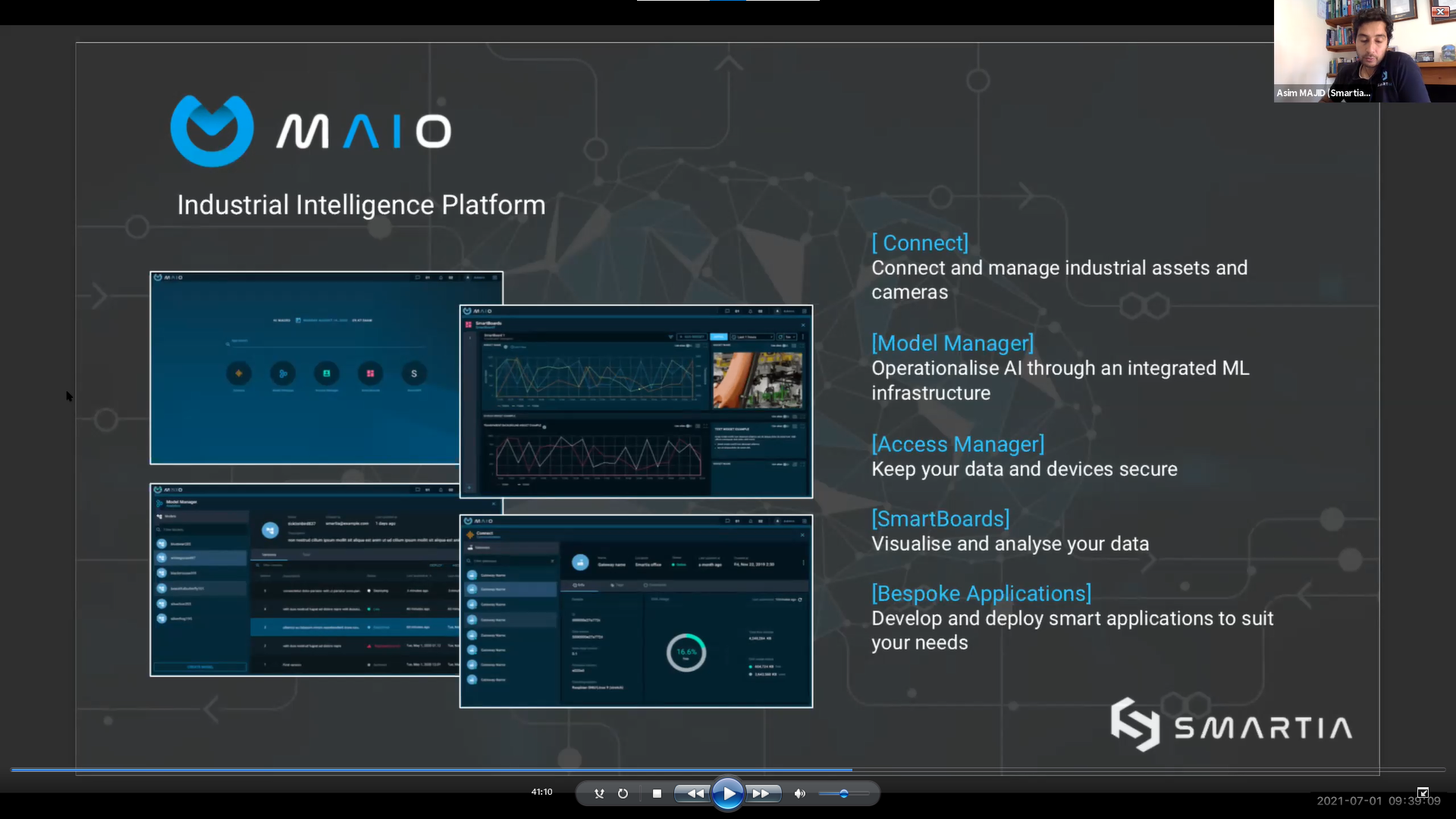 続いてSmartia Ltd.のAsim Majid氏から、エッジ・コンピューティング、ビッグデータ技術、AIのアプリケーションを組み合わせ、現場の産業データをデジタル化し運用する産業インテリジェンスプラットフォームの“MAIO”をご紹介いただきました。