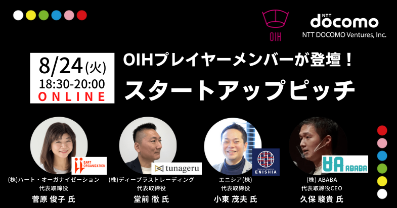 大阪イノベーションハブ、 株式会社NTTドコモ・ベンチャーズ、共催にてピッチイベントを開催。大阪イノベーションハブのプレイヤーメンバーであり、アクセラレーションプログラム、OSAPやSIOの卒業生を中心に4社にご登壇いただきました。