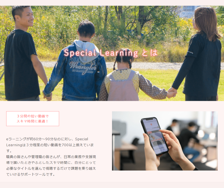 そんな、障がい福祉における課題解決に向け、志村氏が打ち出した事業が、障がい者支援者向けのオンライン研修サービス『Special Learning』だ。場所や時間が制約される従来の集合研修や対面授業とは異なり、スマートフォンやタブレット型端末、パソコンがあれば、いつでもどこでも学ぶことができる。しかも、教材コンテンツは1本あたり3分ほどの動画。難しい資料を読み込むこともなく、誰もが理解できるようポイントを押さえた学びを可能にした。