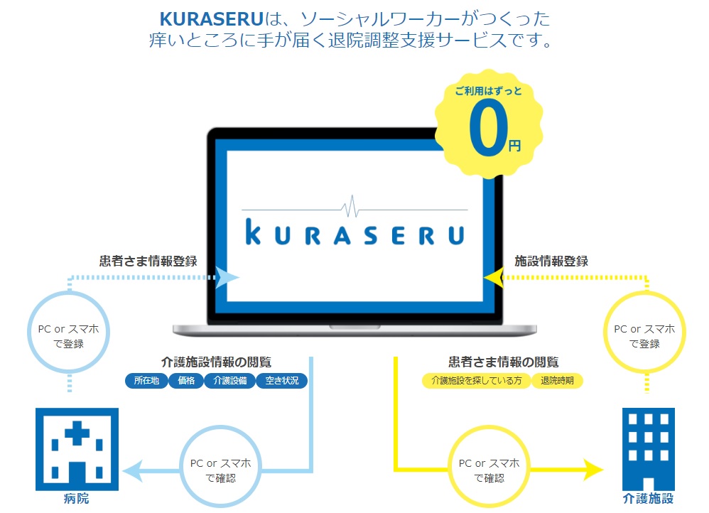 『KURASERU』の大きな特徴は、BtoB向けシステムであるということだ。ユーザーは医療機関と介護施設。医療機関からすると、登録されているすべての介護施設情報や空き状況などが一目でわかり、退院患者のために最適な施設を提案できる。介護施設からすると稼働率を高めるために闇雲に営業する必要がなく、病院から受け入れる際も担当医療ソーシャルワーカーとスムーズなコミュニケーションが可能。双方ともに今まで費やしてきた膨大な時間と労力を削減することができるという仕組みだ。