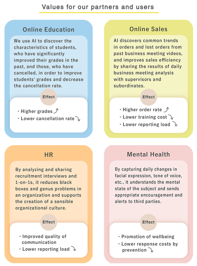 These services of I’mbesideyou are already being applied in various situations. Take for example, a service that analyzes videos of online classes and visualizes communications between the instructors and their students to check whether the instructors are providing appropriate instruction. It even leads to improved grades for the students because the analysis helps to improve the teaching content’s quality. I’mbesideyou offers another service that helps businesses to build better relations with their customers by using AI to analyze videos of online business negotiations and identify trends in negotiations that lead to both successful and unsuccessful orders.