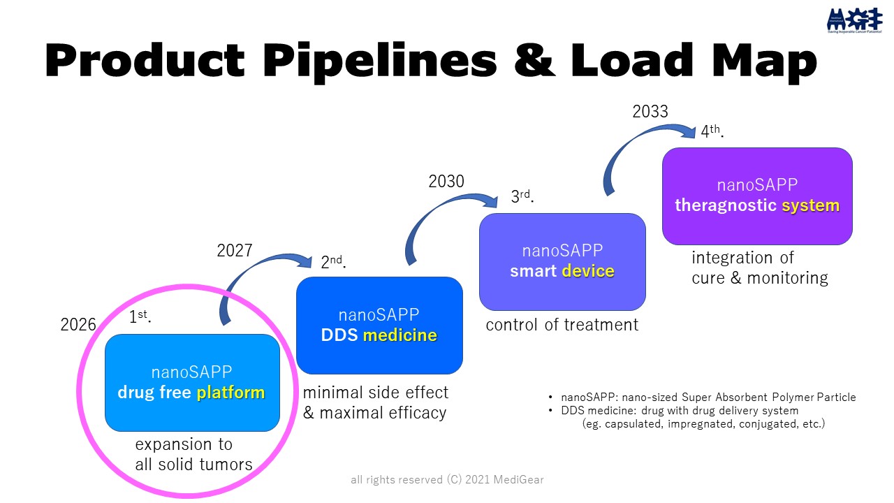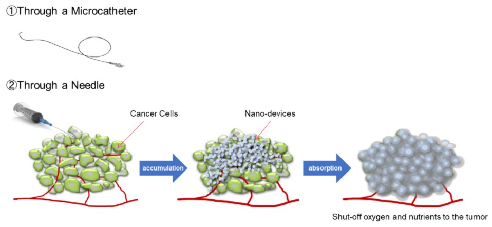 Increased cancer cell reproduction necessitates rapid growth of blood vessels that the cells can draw oxygen and nutrients from, leading to gaps of the tumor vessels. MediGear International’s treatment uses nanodevices that have been modified for these blood vessels’ gaps. After the nanodevices are injected via a catheter, they absorb the water that is inside the cancer cells to form a gel that cuts off the supply of oxygen and nutrients coming from the blood vessels. Starved of essentials, the cells die.