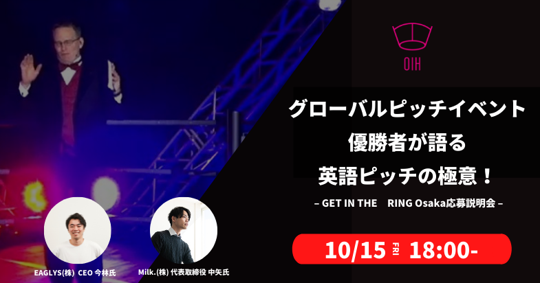●本イベントで取扱う個人情報につきましては大阪イノベーションハブ(運営:公益財団法人大阪産業局)、GET IN THE RING事務局(本部・オランダ)と共有させていただきますことをご了承ください。