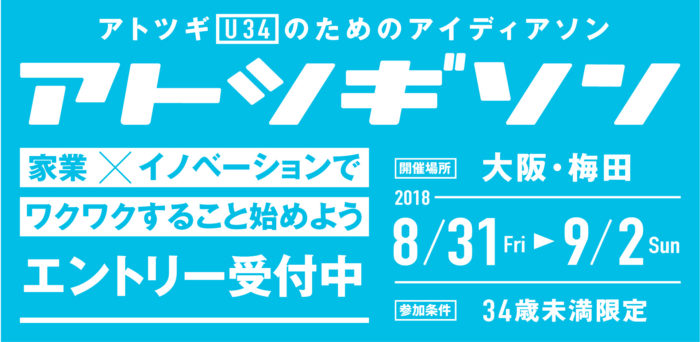 ◆アトツギソン 【日時】2018年8月31日(金)~9月2日(日) 【実施場所】 <DAY①:8/31(金)> 関西大学梅田キャンパス「KANDAI Me RISE」 <DAY②③:9/1(土)~9/2(日)> 「大阪イノベーションハブ」 【参加費】5,000円(※3回の食事代を含む) 【定員】30名 【対象】 ・親族が商売や事業をしているけど、将来継ぐかどうかを迷っている34歳未満の学生や社会人 ・既に、家業に従事しているけど、なんかおもしろいことを始めたい34歳未満の方 ・アトツギではないけど、新規事業に興味がある34歳未満の起業家、起業志望の方アトツギソンの詳細/申込みはコチラ