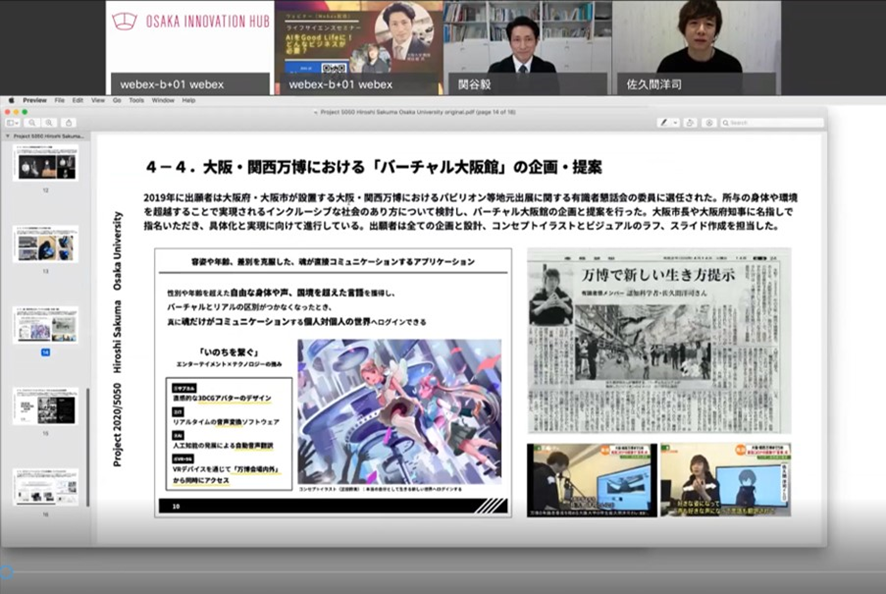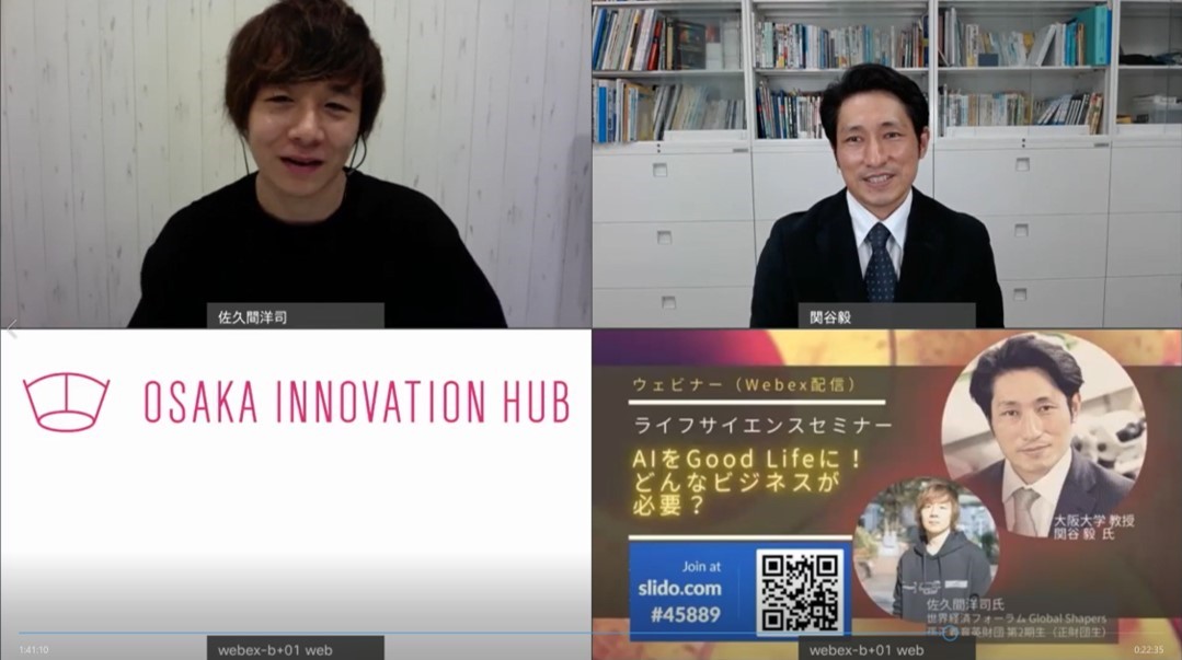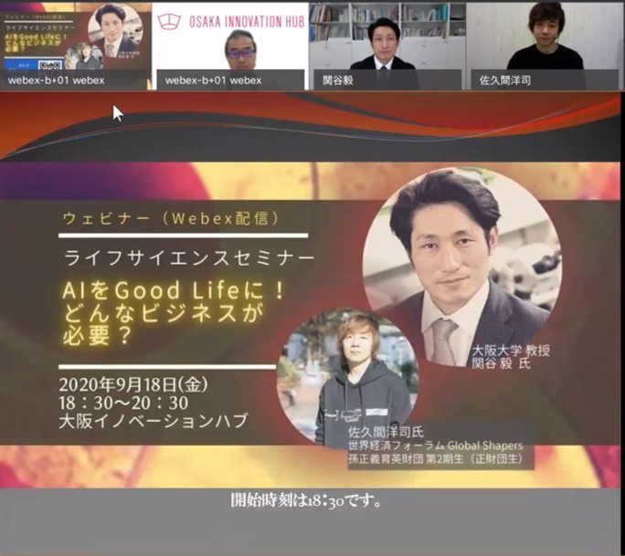 プログラム開始に先立って9月18日にプレイベントを開催しました。医療系ベンチャーを立ち上げ、日経ビジネス「次代を創る100人」に選出された、大阪大学教授の関谷 毅氏と、大阪大学基礎工学部在学中で世界経済フォーラムが認定する『Global Shapers』にも選出された佐久間 洋司氏にご登壇いただき、AIを活用したライフサイエンス分野における事業化事例等についてお話しいただきました。