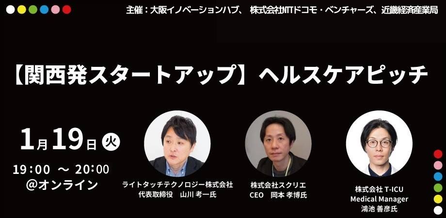 大阪イノベーションハブ、 株式会社NTTドコモ・ベンチャーズ、近畿経済産業局の3社の共催にてピッチイベントを開催。J-Startup KANSAIに採択されたヘルスケアスタートアップを中心に3社にご登壇いただきました。