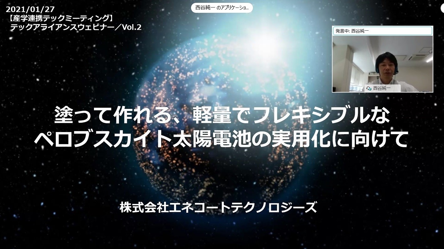 2社目は、京都大学発ベンチャー「株式会社エネコートテクノロジーズ」開発部マネージャー 西谷純一氏より、次世代太陽電池の本命であるペロブスカイト太陽電池の開発について、製造工程や、低照度でも高発電可能な特徴を活かし、使用用途について発表していただきました。