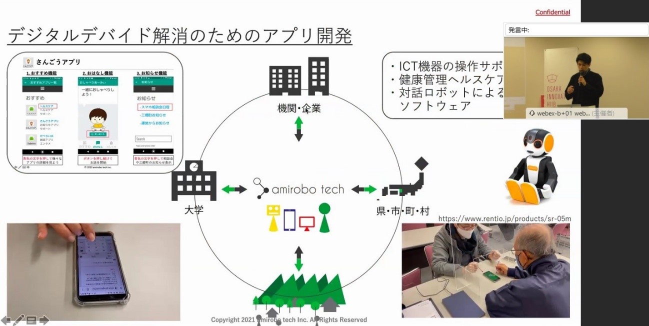 3社目は、奈良先端科学技術大学院大学発ベンチャー「株式会社amirobo tech」CEO 澤邊太志氏より、SNS等で、巷にあふれる情報やツイートから良質な情報をフィルタリングし、独居高齢者や一人暮らしの方がテレビを視聴する際、アプリやロボットから共感や協調できる情報を提供するサービスについて発表していただきました。