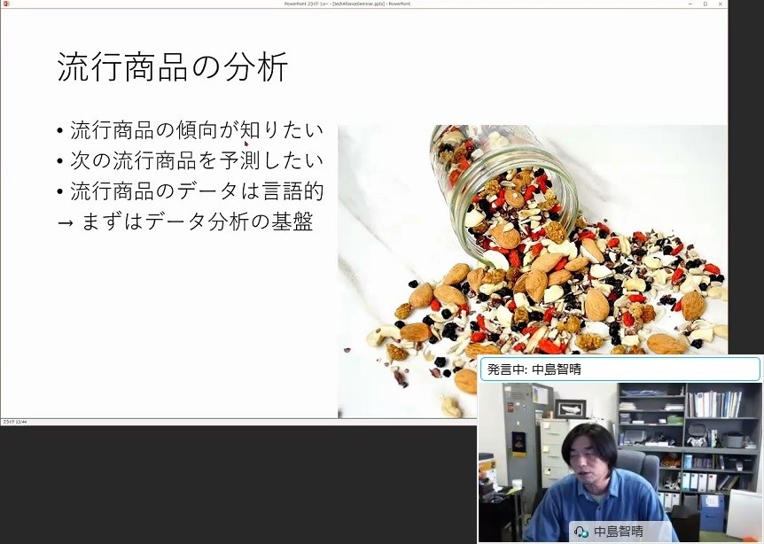 4社目は、大阪府立大学大学院 中島智晴教授より、昨今、社会実装が進むAI技術ですが、教授が得意とする予測モデル(流行商品予測や売上予測)を獲得するための機械学習についての説明と、精度を上げるためには、良質なデータが揃っていることが重要というお話をされました。