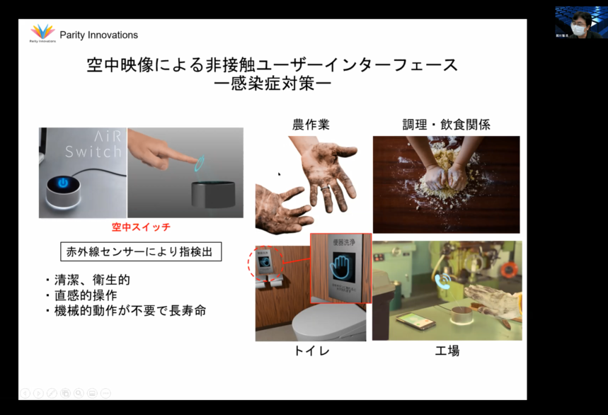 登壇いただいたのは「非接触型操作デバイスの開発」を行う知能技術株式会社、「空中映像を実現するミラーの開発」を行う株式会社パリティ・イノベーションズ、「オンラインでの遠隔接客サービス」を行う株式会社TECH MONSTERの3社。