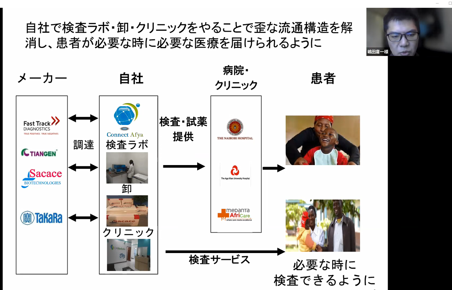 新型コロナが始まる以前よりPCR検査をはじめとする各種の医療検査を自社ラボで提供し、検査薬や検査機器へのアクセスが限られがちな現地の検査施設・病院への物流ビジネス、自社でクリニックも展開。世界の医療サービスの状況とケニアの比較、他国への展開の構想、アフリカのポテンシャルについてもお話しいただきました。