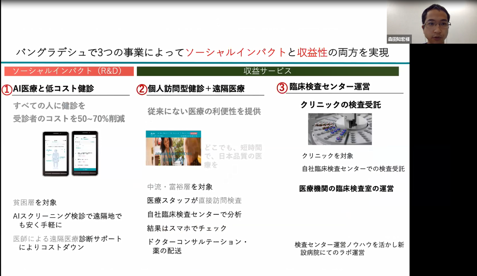 ベトナム、インドと比べて、バングラデシュの成長率が高いこと、一方で貧困層や遠隔地での医療アクセスは極限られていること、その中で3つの事業でソーシャルインパクトと収益性を実現させている仕組みについてお話いただきました。バングラデシュで確立する遠隔医療の成功モデルを、アセアン、次いで日本への応用可能性も見据えているそうです。