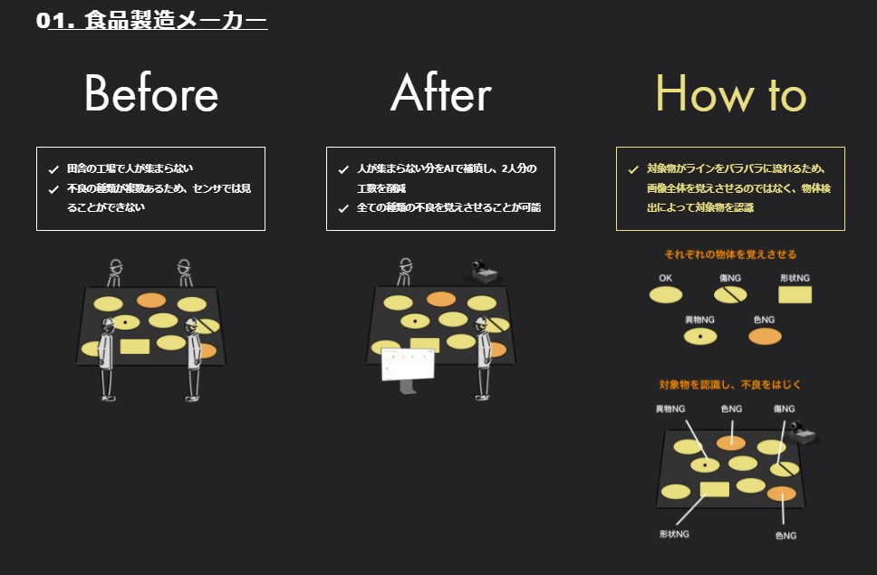 同社は、「はやい、やすい、巧いAIを」というスローガンを掲げている。AIはさまざまな分野で導入が進んでいるとはいえ、価格が高く、利用できる企業は限られてしまっている。しかし、人手不足や目視検査の効率化という課題は、中小企業が抱えていることが多い。