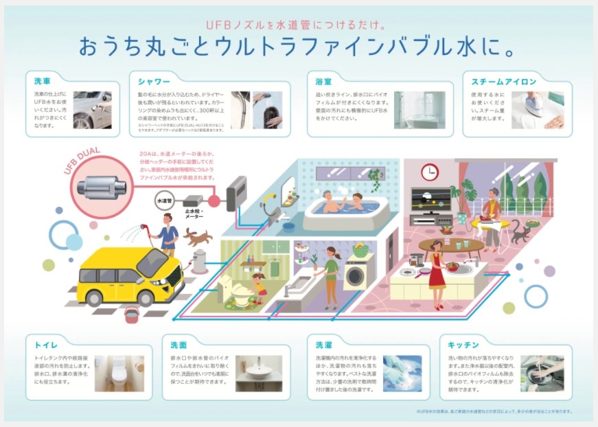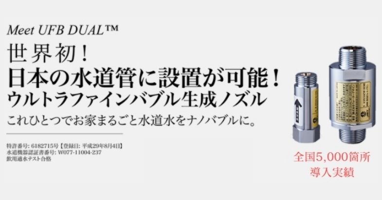 『UFB DUAL』は、特許を取得した独自の機構によって水圧・水量減を大幅に解消し、外気を使わず水中の酸素を使用する泡の生成法によって高い安全性を実現。