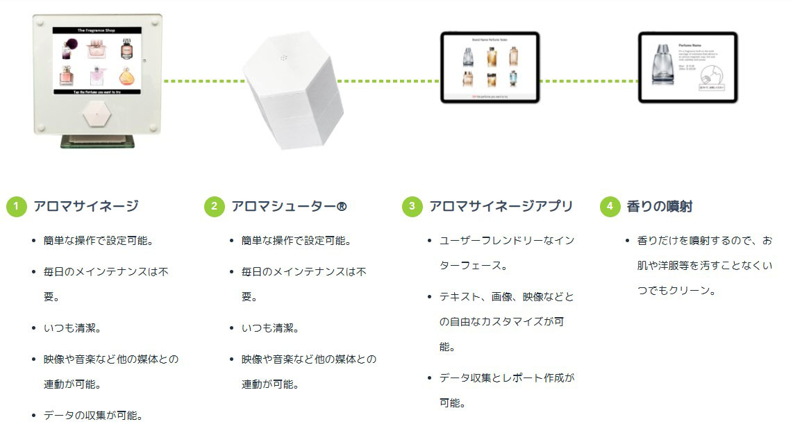 その可能性のひとつが、デジタルサイネージ分野。当社では“アロマサイネージ”と呼んでいるもので、香りによってショップへ誘導したり、香水テスターなどを活用して商品PRを行うもの。