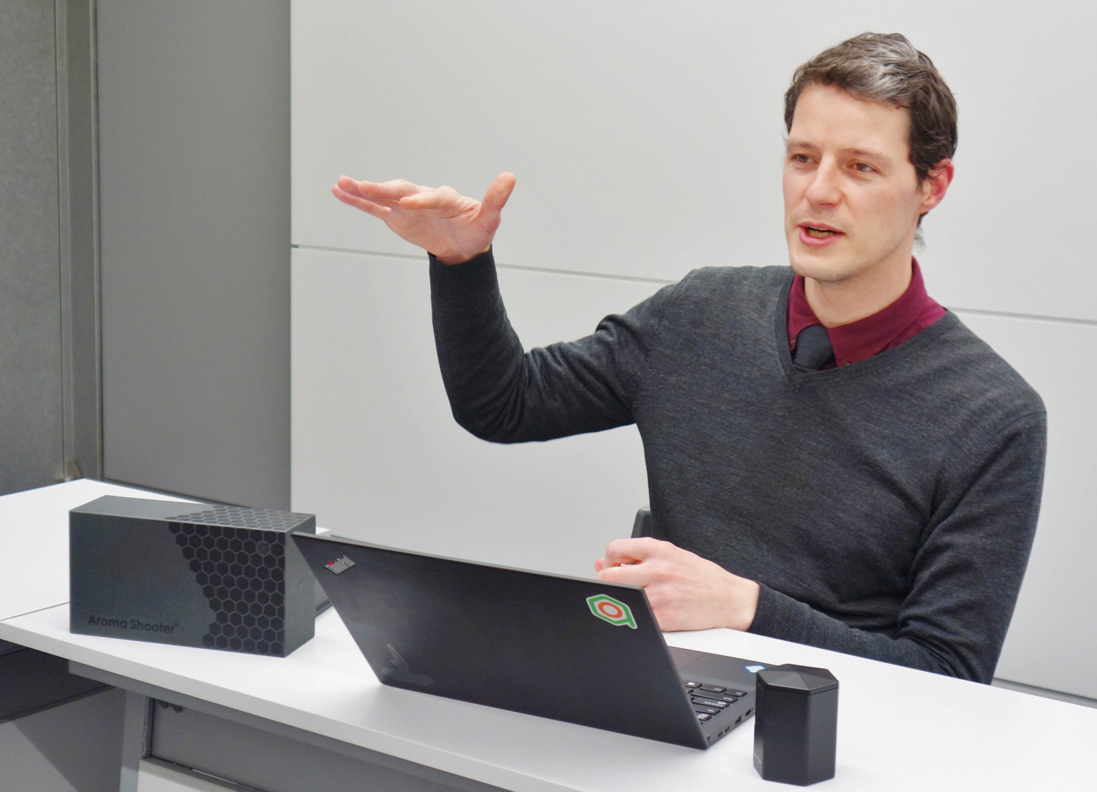 なかでも、『アロマシューター』という嗅覚ディスプレイが持つビジネスの可能性をカタチにし、新たなマーケットを構築していくことが目下の最重要課題。