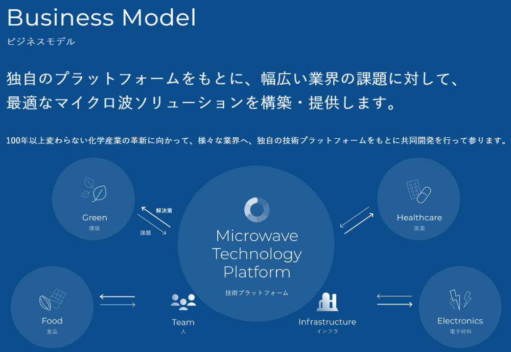 2007年の創業時から、産業化は困難と言われていたマイクロ波プロセスの事業化に取り組み続け、マイクロ波技術のプラットフォームを確立。現在は、医薬・電子材料・食品など国内外のさまざまな分野のメーカーや機関と提携。自社の技術プラットフォームをもとに、研究開発からエンジニアリングまでトータルソリューションを構築・提供できるまでになり、2022年6月には東京証券取引所グロース市場でのIPOを果たした。