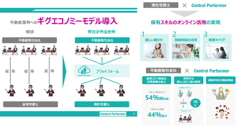 「私たちが取り組む『Central Performer』事業は、不動産取引会社と潜在宅建士を結びつけるサービスです。ポイントは、『従来的な企業と有資格者の直接の雇用関係を橋渡しするのではなく、潜在宅建士がギグワーカーとなり、好きなときに、好きなだけ働けるようにすること』です。企業側にとっても、必要なときにだけ宅建士の力を借りることができます。宅建士を雇用することにともなう課題や、潜在宅建士にオンラインを活用した、距離や場所に依存しない、新しい働き方を提供することで、不動産業界で働く人材が少ないという課題を解決するサービスです」
