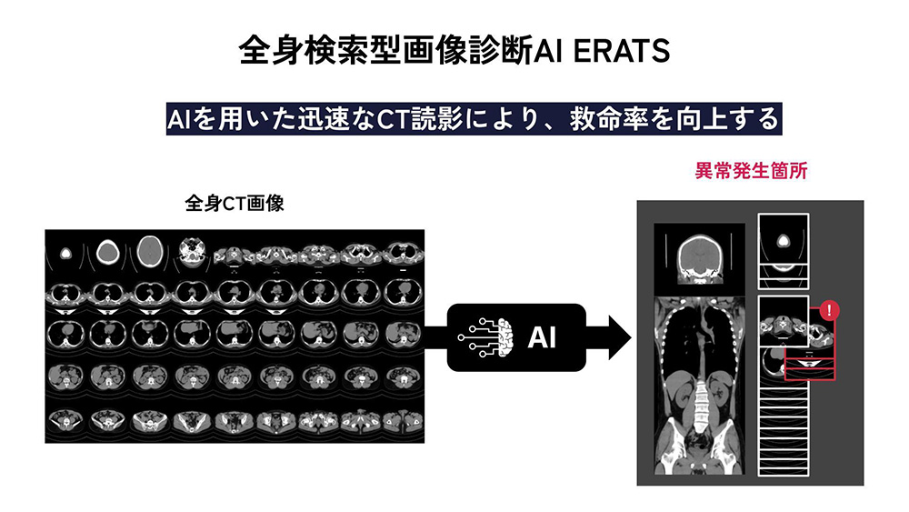 私たちは、AIを使って救急医の仕事を支援するソフトウェアの開発を行っています。目下最優先で取り組んでいるのはCT(コンピュータ断層撮影)による画像診断をAIがサポートしてくれる『全身検索型画像診断ERATS(イーラツ)』の開発です。