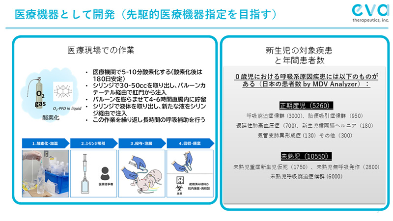 腸呼吸はそのようなケースに有効であると考え、現在は特に期待の高い新生児用医療機器の開発を最優先課題としてEVAセラピューティクスは取り組んでいます。
